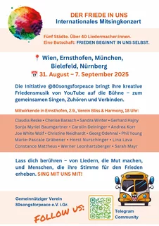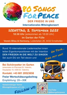 02.09.: 80songsforpeace-Mitsingkonzert im Garten, bei Schlechtwetter im Pfarrsaal St. Valentin, 18:30 Uhr |