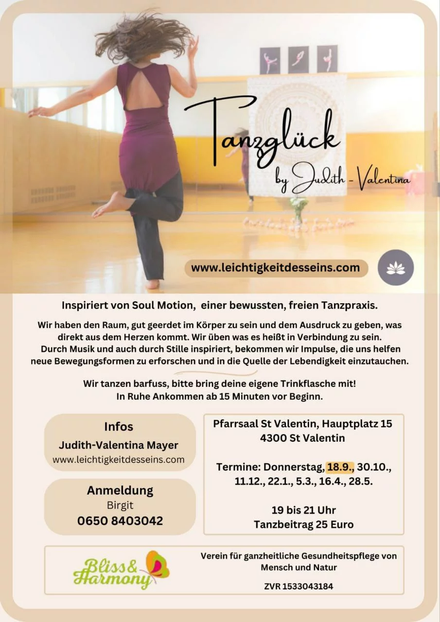 30.10.: Tanzglück mit Valentina, Pfarrsaal St.Valentin, 19 Uhr |